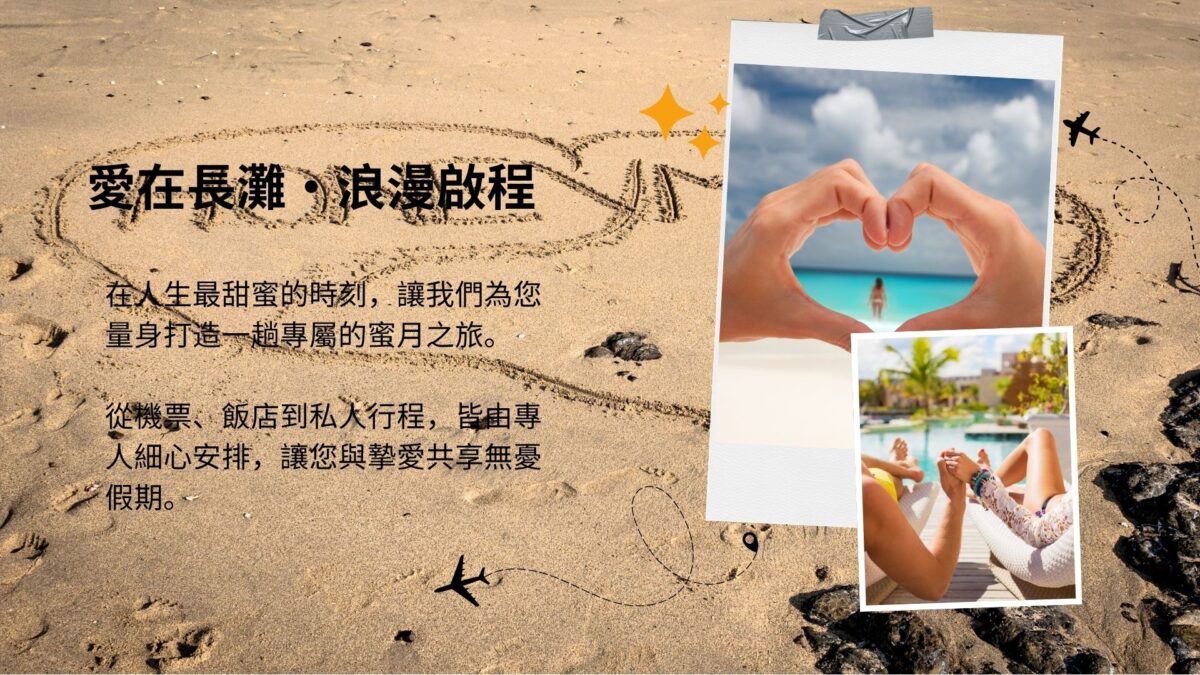 《屬於你們的蜜月旅程》當婚禮的繁華落幕,世界變得只剩你和我,這段旅程,是我們的開始,也是最真實的浪漫。想像一下,晨光灑在白沙上,我們赤腳踩著細軟的沙粒,海浪輕拍腳踝,微風夾帶椰香,日落時分,天空被染成橘紅,星光輕灑在我們肩上,笑聲與心跳交融成永恆。