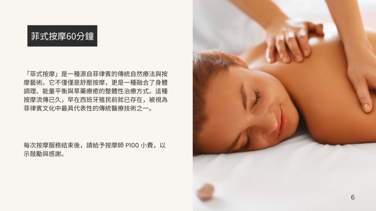 6. 當地一些活動也會有給付小費的習慣,請您留意:按摩60分鐘100peso/120分鐘200peso…每60分鐘增加100peso 以此類推。