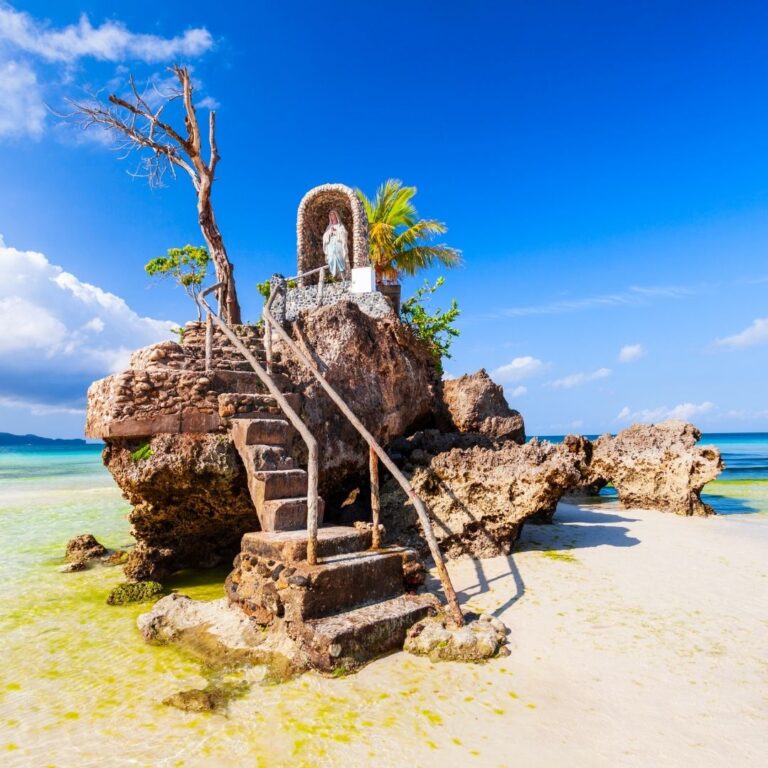 位於 White Beach Station 1 的 Willy’s Rock 是長灘島最具代表性的景點。海中岩礁上的聖母像成為白沙灘的經典象徵,也是旅客拍照打卡的熱門地標。退潮時可步行靠近岩礁,漲潮時海水環繞,展現不同的美景,無論白天或夕陽時分,都能拍出絕佳畫面。鄰近高級度假飯店,交通便利,是短暫停留或散步放鬆的理想景點。