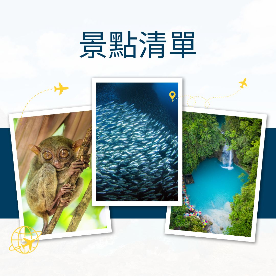 麥克坦島 |跳島|海上活動|度假放鬆 宿霧市區| 市區觀光|歷史景點|購物 宿霧南部| 鯨鯊共游|瀑布|自然景觀薄荷島|巧克力山|眼鏡猴|沙灘度假